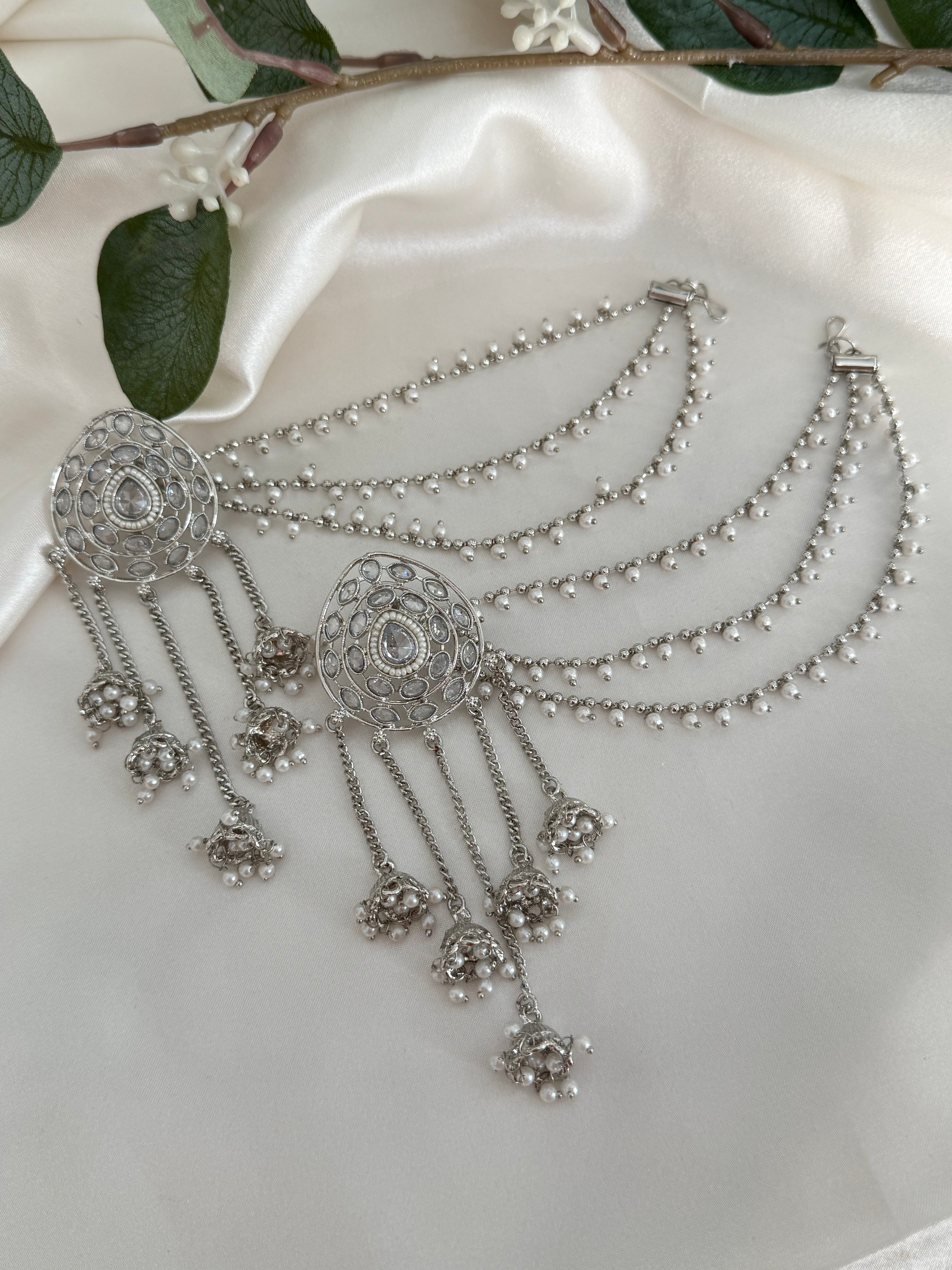 Elevate your look with our Polki earrings Set with Saharas , crafted with radiant faux Polki stones set in a silver -polished, high-grade alloy metal. This exquisite earrings set includes an earrings and Saharas, designed to add a touch of royal glamour.