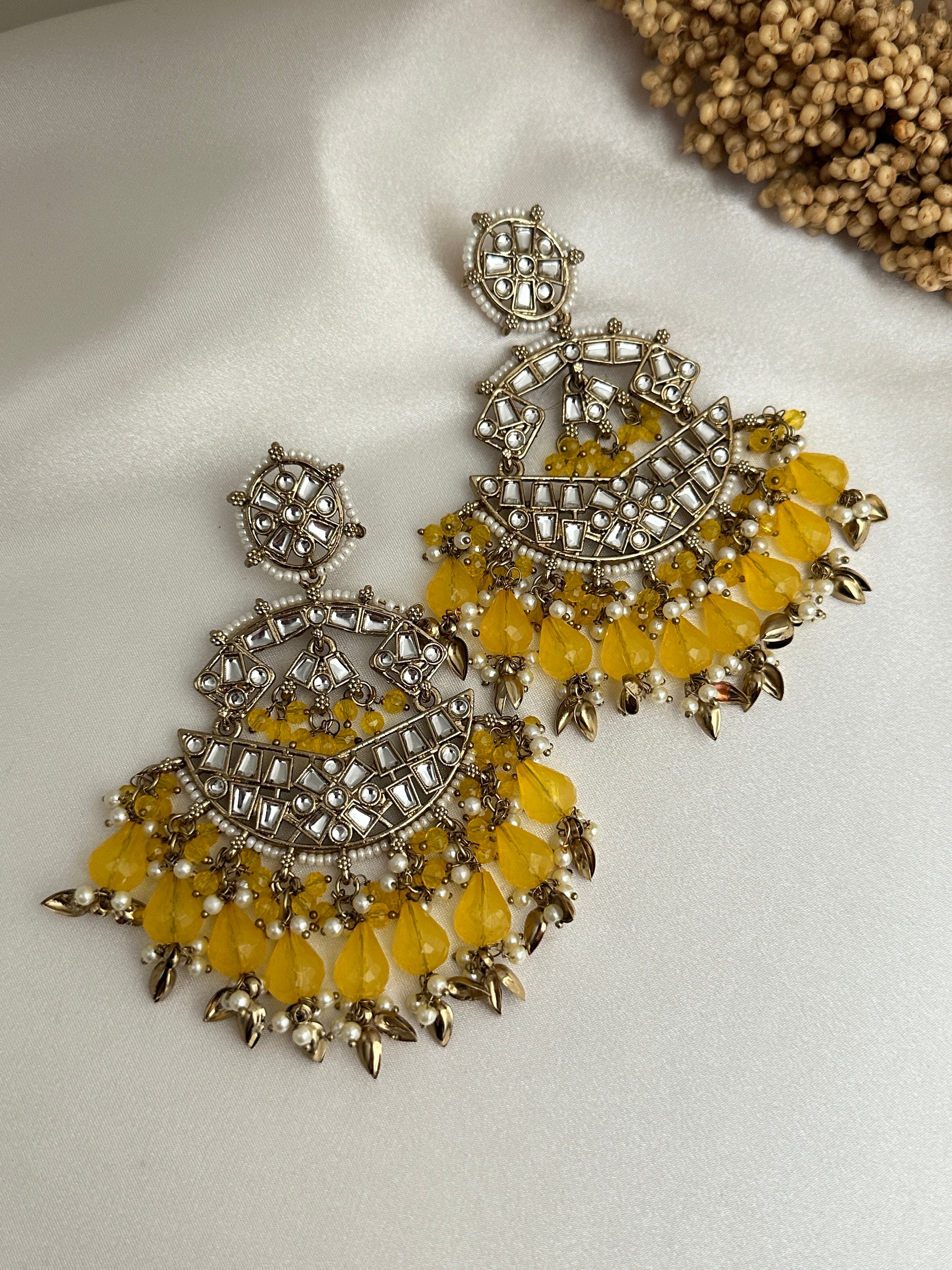 Introducing our exquisite Yellow Kundan Earrings, delicately detailed with piple patti accents for a touch of elegance. Crafted with faux Kundan stones and beads on a high-grade alloy metal base, these earrings are sure to add a vibrant splash of color to your ensemble, making them perfect for special occasions