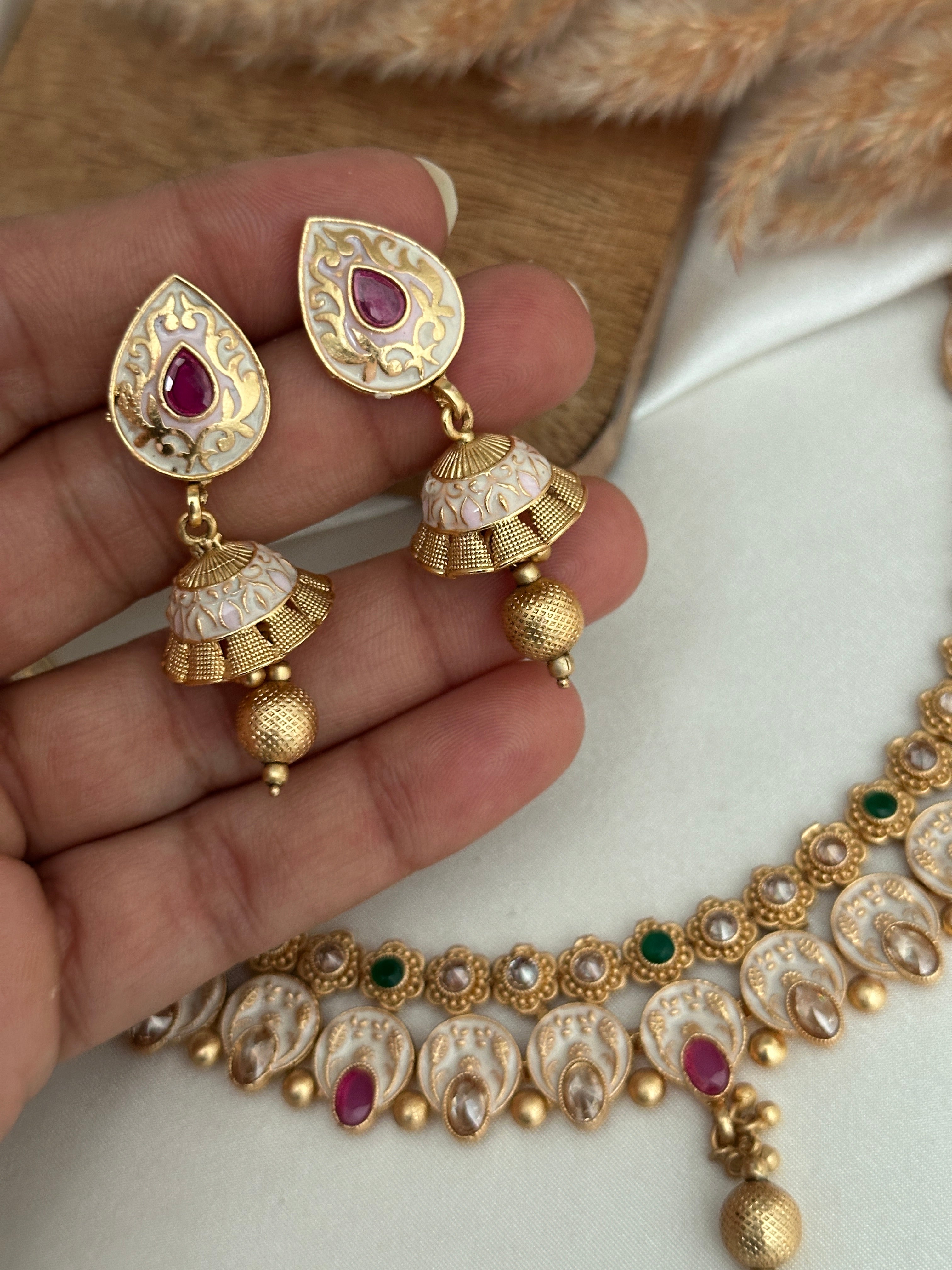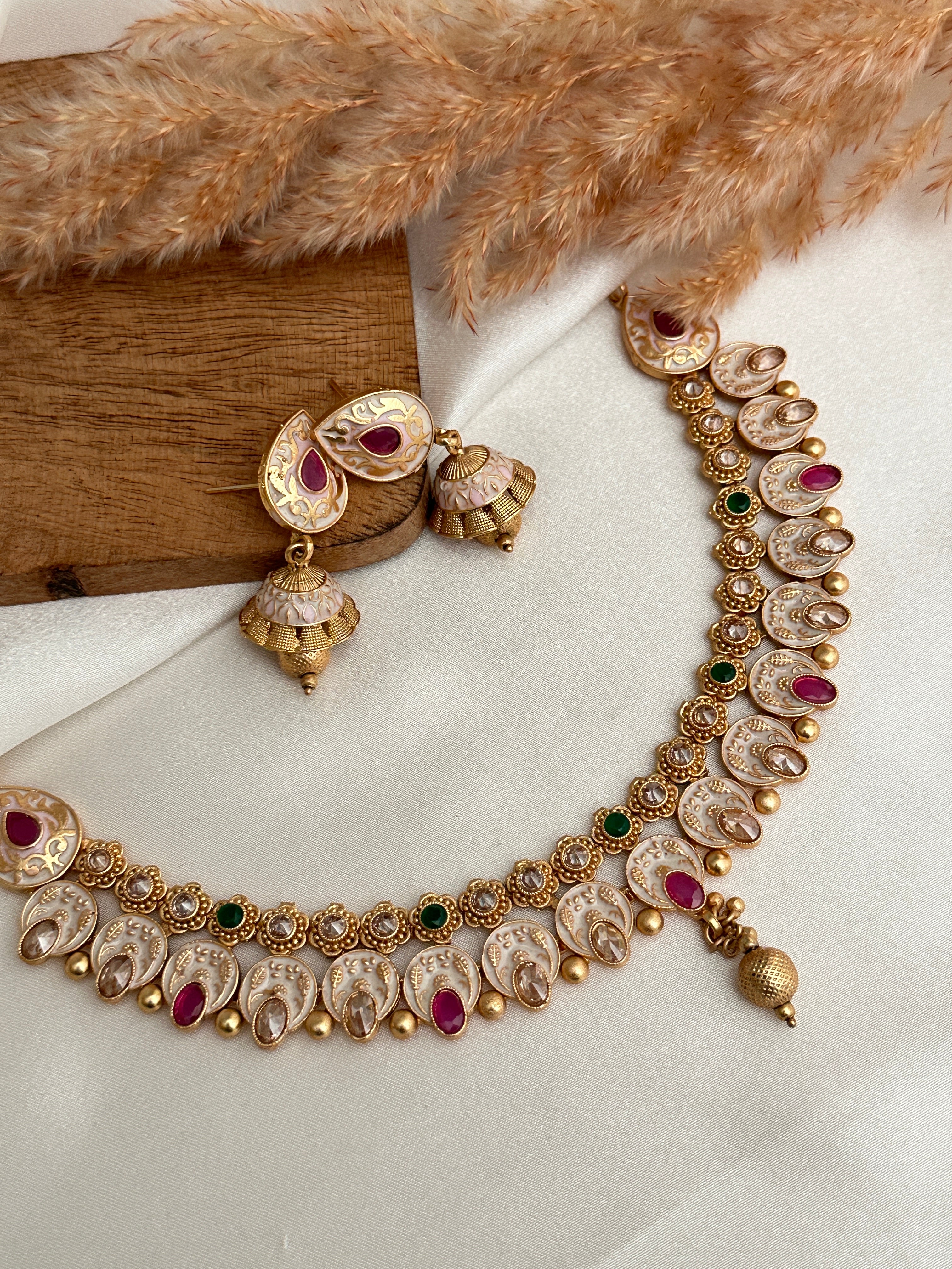 Introducing our exquisite Meenakari Polki Necklace Set – a fusion of regal charm and modern sophistication. This captivating ensemble is designed to add a touch of glamour to your look, making it the perfect choice for special occasions and cherished celebrations.