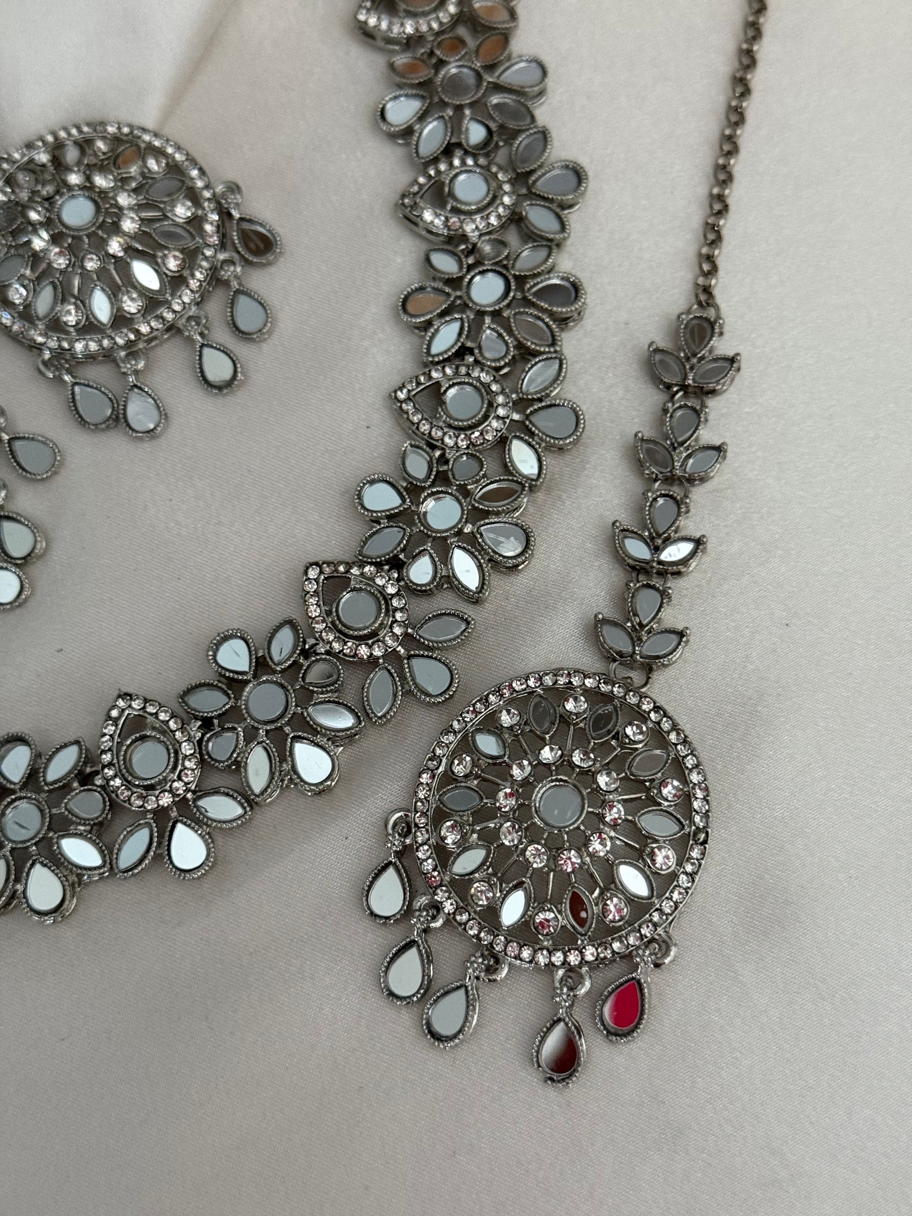 Dazzle in our Pearl Silver Polki Necklace Set, where each piece, from the necklace to the earrings and Tikka, is meticulously adorned with faux pearl and Polki stones and beads on a high-grade alloy metal base. This radiant ensemble promises to elevate your attire, adding a touch of elegance and tradition to your special moments.