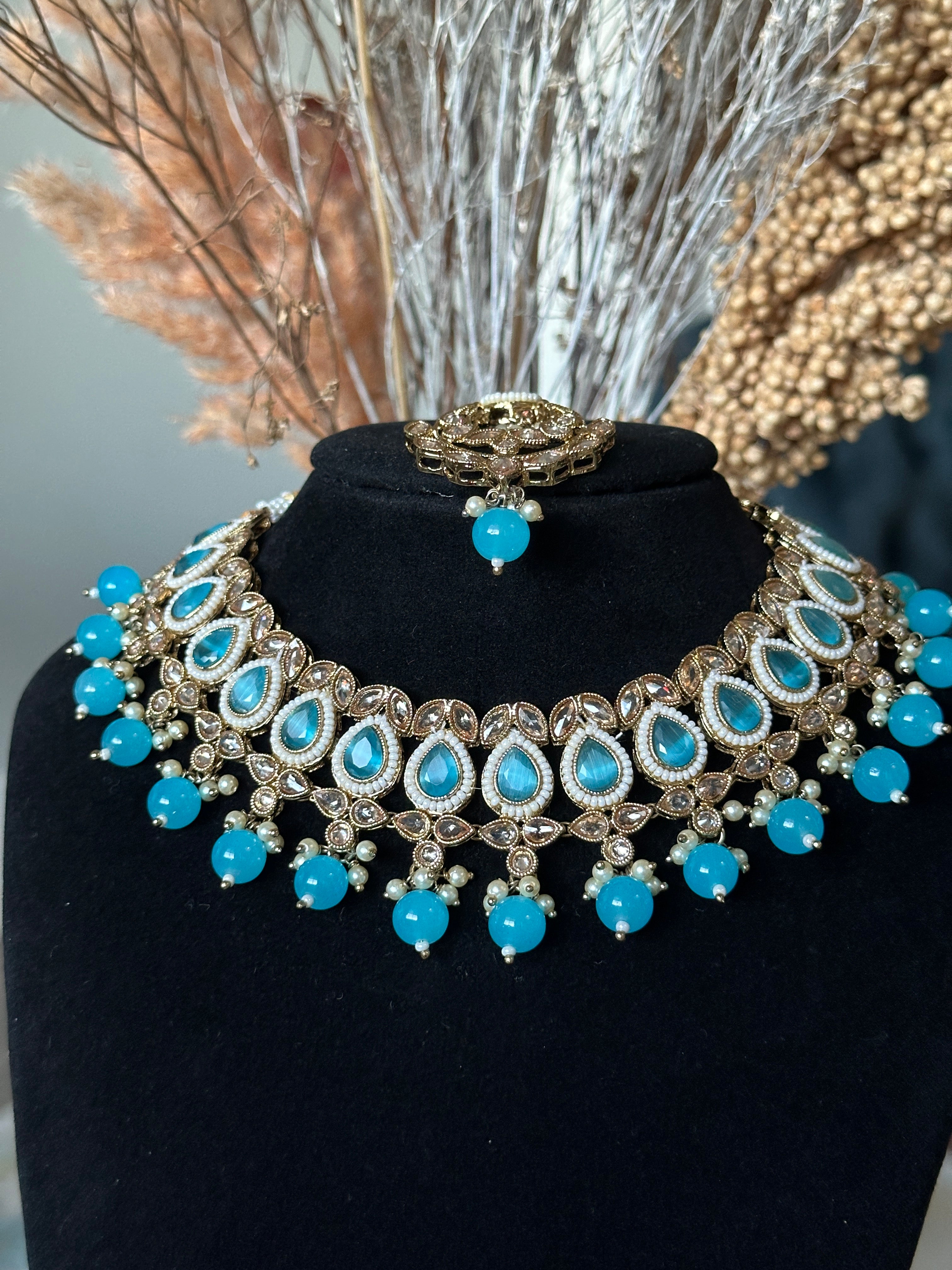 Enhance your elegance with our Turquoise Polki Necklace Set, featuring faux Polki stones and turquoise beads. Crafted from high-grade alloy metal, this set includes a necklace, tikka, and earrings, adding a touch of sophistication to your ensemble