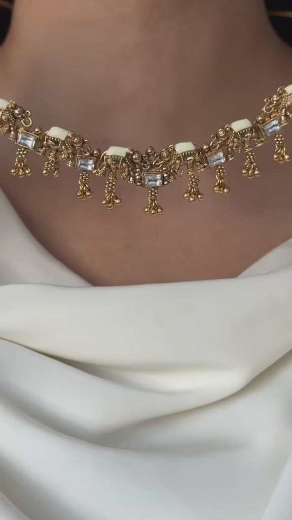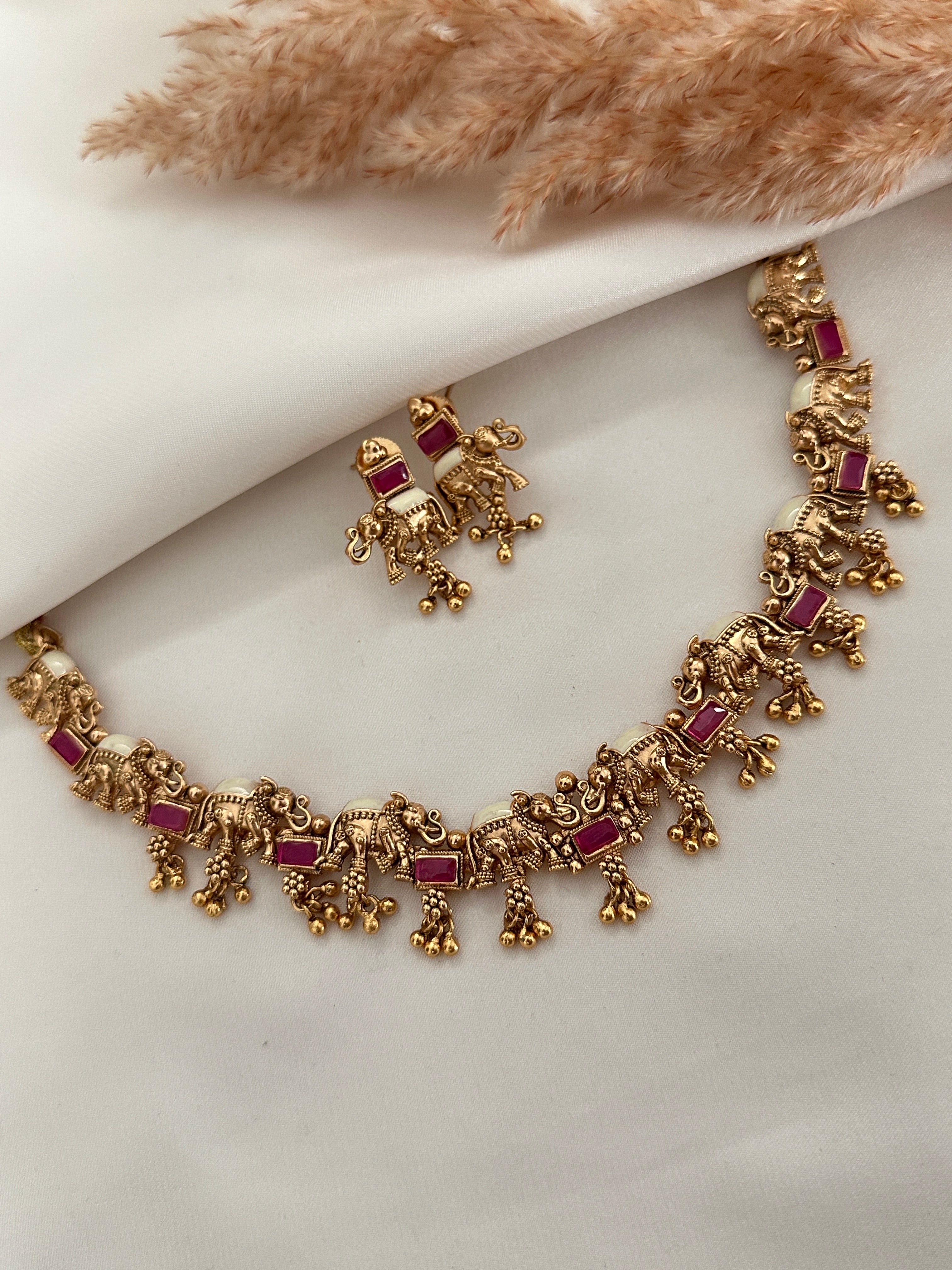 Elevate your elegance with our Elephant design Antique gold Necklace Set, featuring elephant and Kundan stones. Crafted from high-grade alloy metal with a luxurious gold polish, this set includes a necklace and earring.