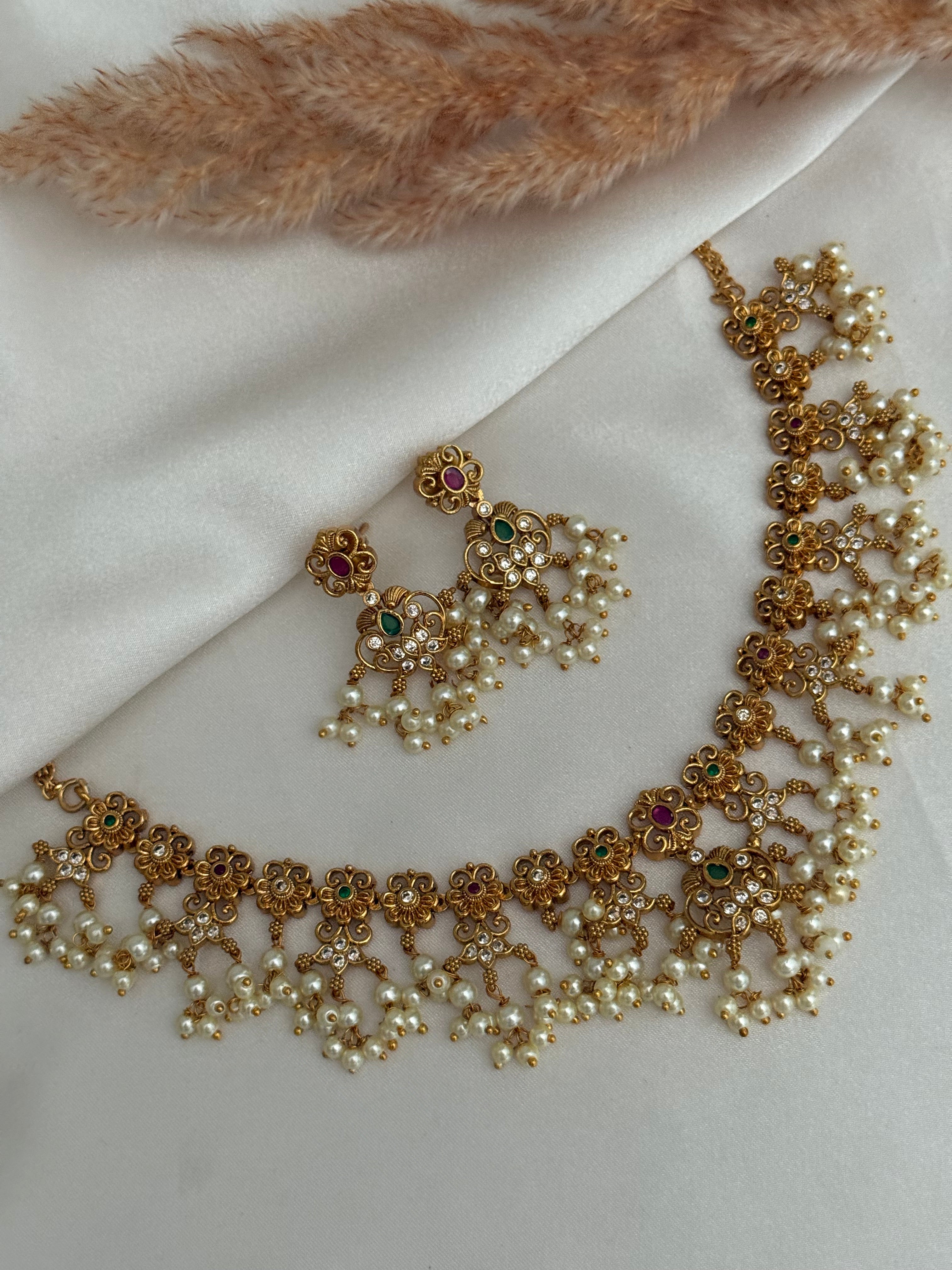The Ruby Pink and Green Antique Gold Choker Set dazzles with its vibrant ruby pink and green colours, embellished with faux Kundan, pearls, and beads on a base of high-grade alloy metal. This set, which includes a necklace and matching earrings, reflects traditional opulence with a modern twist.