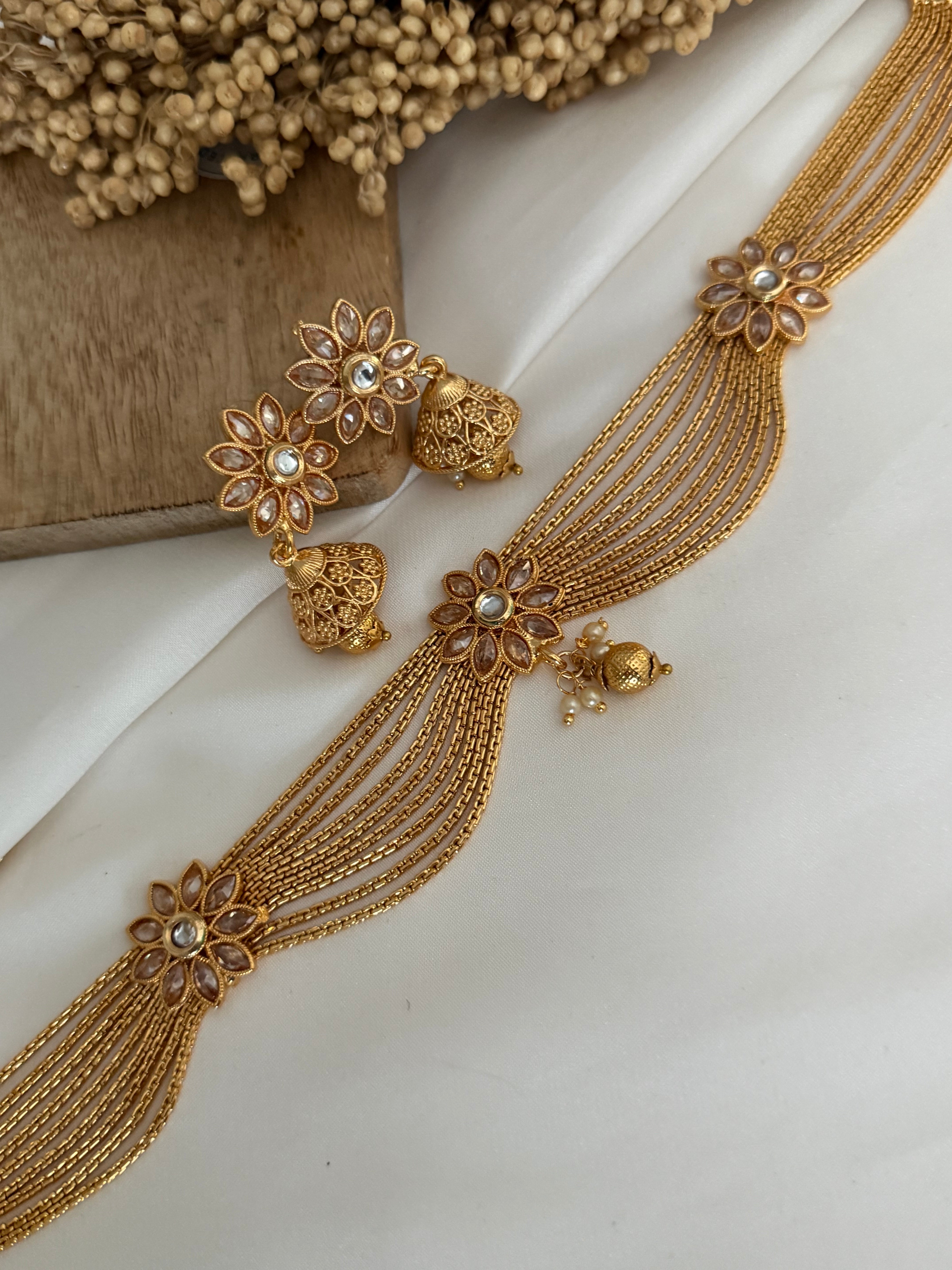 Enhance your elegance with our Gold imitation Pearl Polki Necklace/Choker Set, featuring faux Polki stones and pearls . Crafted from high-grade alloy metal, this set includes a necklace and earrings, adding a touch of sophistication to your ensemble